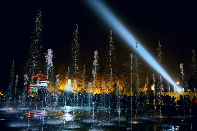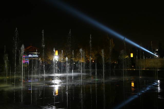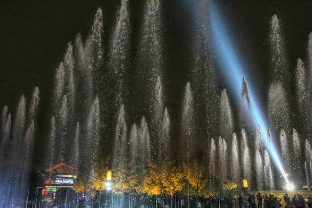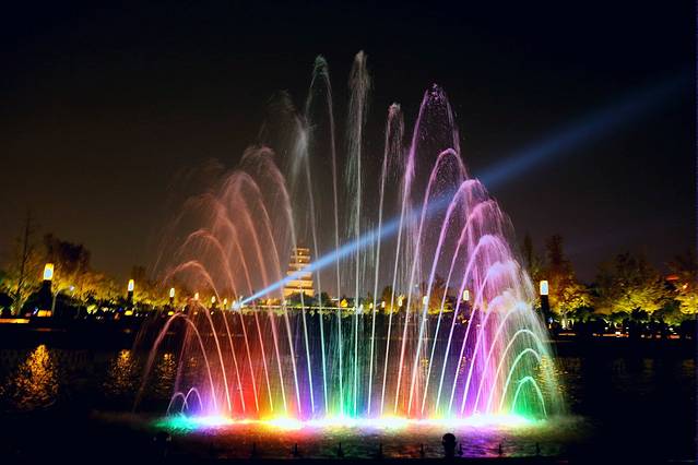 大雁塔的音乐喷泉,号称全亚洲最大的音乐喷泉。整个音乐喷泉持续20分钟。我看的这一场正是8点30分的,8点就已经来到占位置了。