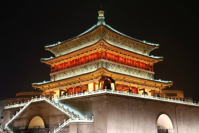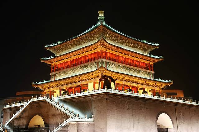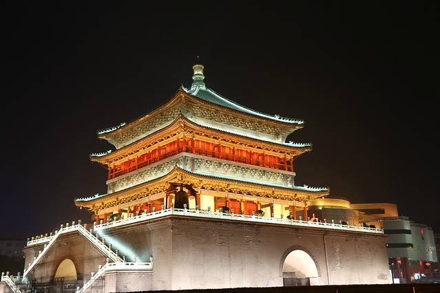 它位于西安繁华的东、西、南、北4条大街交汇处。古时用来在清晨敲钟报时,所以叫做钟楼。