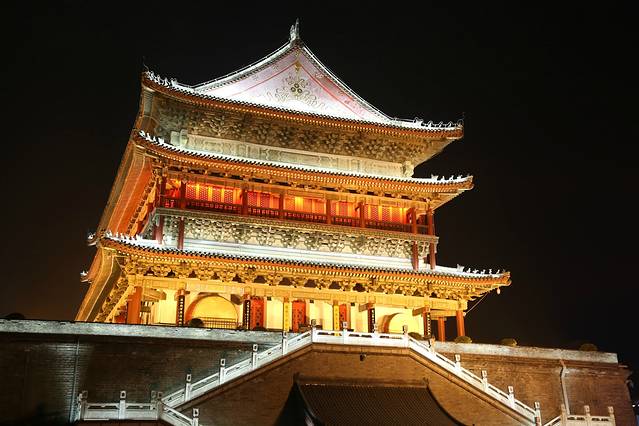 西安鼓楼位于古都西安市中心,明城墙内东西南北四条大街交汇处西北方约200米处。