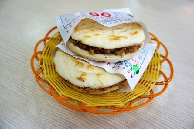 最常吃的肉夹馍是腊汁肉夹馍,外面这层皮称为白吉馍,形似“铁圈虎背菊花心”(感觉像当初被中药材的形状特征~),皮不算太厚,很松脆,肉馅松软,但是要趁热吃,冷了的话皮比较硬,加上肉夹馍本来就很干,会影响口感。