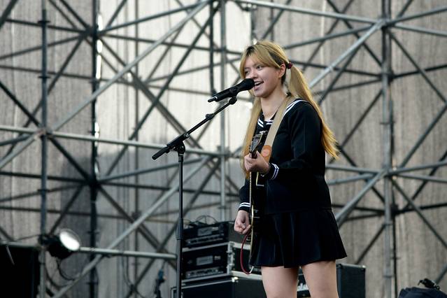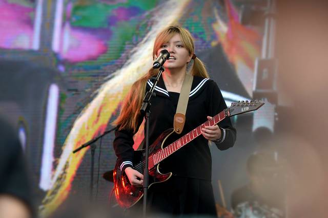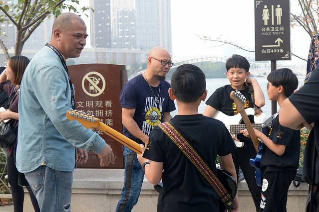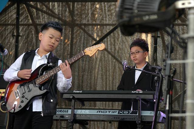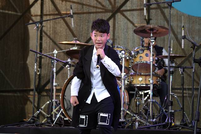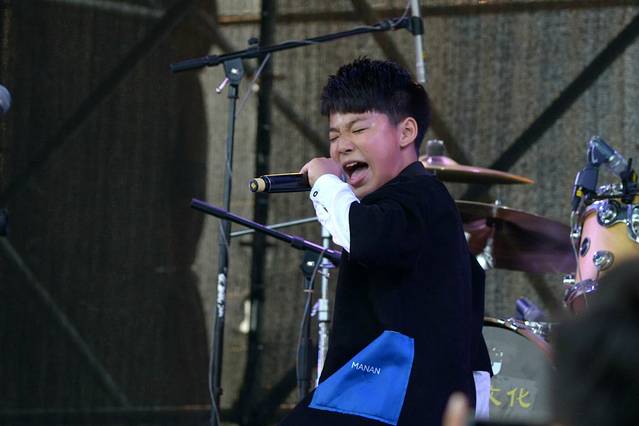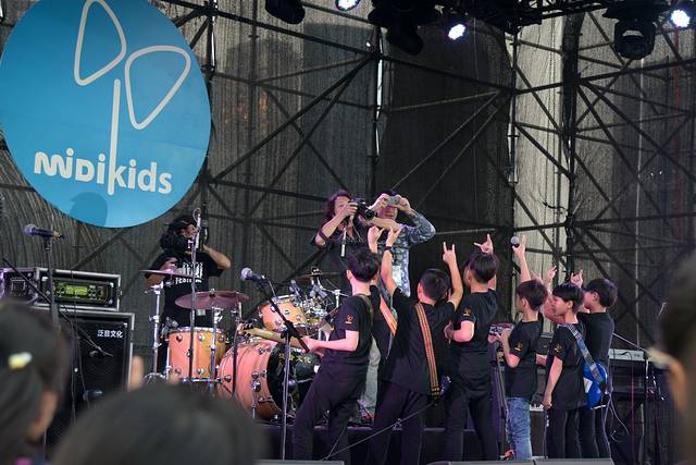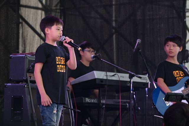 孩迷舞台这边传来稚嫩的歌声,先这里看看吧。这是来自杭州的“芒果”乐队,主唱吴开成。