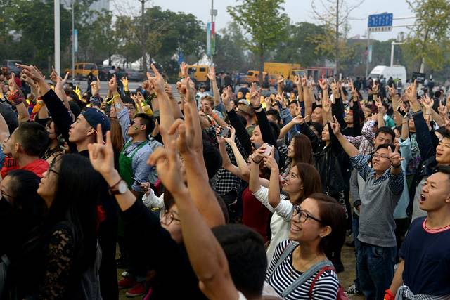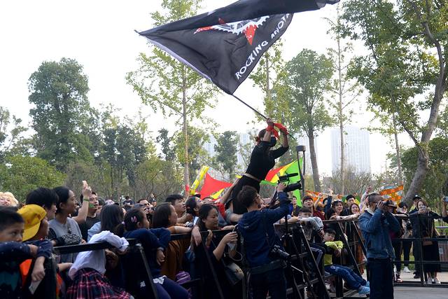 “孩迷”也有歌迷,瞧这位黑衣MM挥舞着大旗现场造势。