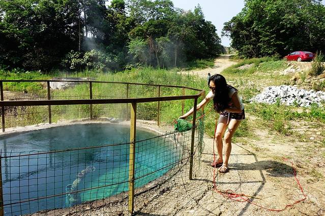 早餐过后,就来到在酒店附近的温泉源头来煮温泉蛋。地方虽近,但走路不方便,建议直接开车过来,问服务员就知道路了。生鸡蛋在员工宿舍区那里的小卖部有卖,而且还能免费借到装鸡蛋的网兜。