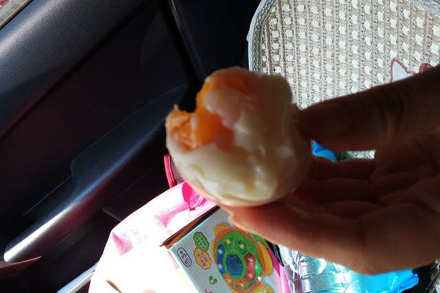 当地人介绍说,这个温泉水温高达90 度以上,反正我是不敢直接摸,我相信他。把蛋装好,然后梆上绳子,慢慢放到温泉里,放到水里后,把绳子固定在边上就行,人赶紧先散吧,因为太热,到时连人都熟了!就是这样,因为水温高,基本泡五分钟以上就可以拿出来了,看看煮出来的温泉蛋怎么样吧!可惜拍的时候手抖了,真的是温泉鸡蛋哟,和日本的温泉玉子一样,蛋白和蛋黄都是胶质,吃起来很新鲜的感觉,六个蛋我们一口气全吃完了,后悔没多煮几个。另外这蛋应该泡下冷水再开,要不蛋壳难去掉。