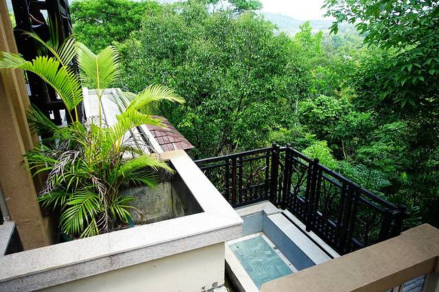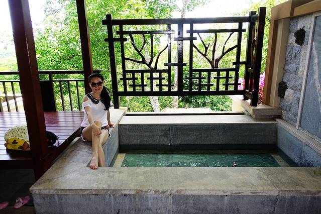 既然有这么好的温泉,当然不要浪费,虽然天气是热一些,温泉的温度是比较高的,但可以放冷水调一下。看一下这个超级无敌的大阳台,右边是浴池,左边是一个小亭子,可以躺在这里看书,上网