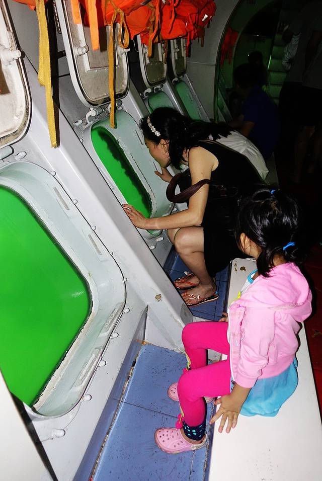 要参加这个活动的,不用门票,直接在码头排队就可以了,因为现在这个时候留在岛上的肯定就是住酒店的,由小船接上一条大船,大船在船仓里是这样的,透过玻璃可以看到海底,这一带的珊瑚相对丰富。