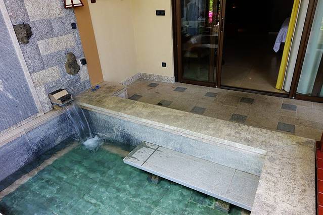 看一下阳台吧,每一个阳台都配有一个独立的小浴池,可以放温泉来泡泡。而且阳台外面的风景也很不错。我们订的这间更好,因为整个阳台都是有顶篷的,不会被晒到。