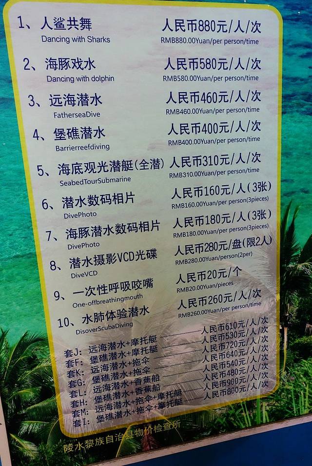 把行李免费寄存在前台,买好海洋文化馆的门票,就先到游客中心逛一下,看看这里一些活动的价格,潜水基本上都是DSD(体验潜水),由潜水教练一带一的,所以价格也相对比较贵一些,近海是400元每人,远海是460元每人,不过潜水的人非常的多,这次因为带了小孩,所以潜不潜呢?有点犹豫呀。