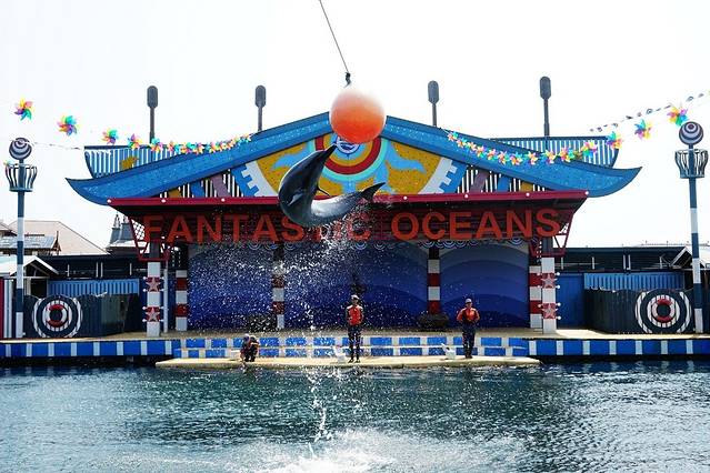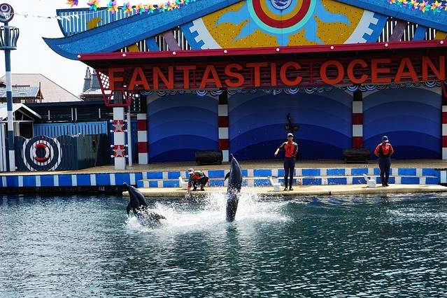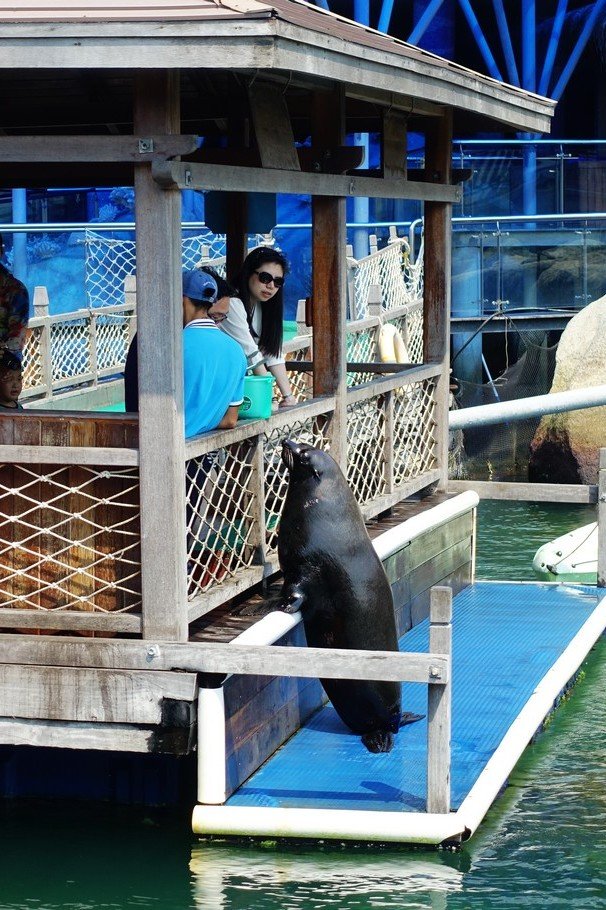 要在这个海洋馆呆上一小时真的不是很容易,不过还好在海豚表演馆里有凳子坐,终于下午2点半到了,表演正式开始,先是海狮来热身表演,那个和普通动物园差不多,我们还是要看一下这里的海豚给不给力。