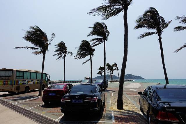 要玩分界洲岛可以在三亚参加那种一日游的散客拼团,有车接送,当天来回。我们自驾的,可以把车直接开到码头,在码头的停车场,有专门过夜用的,你按指示停好就可以,车位还挺多的,当然,今天不算节假日,所以可能车也不多。今天的风很大,看看椰子树都快被吹弯了。