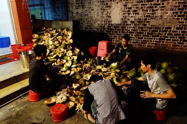你不信这椰奶、椰汁是新鲜的?请看,摊边全是在砍椰子的工人,一晚上要砍一千个不?