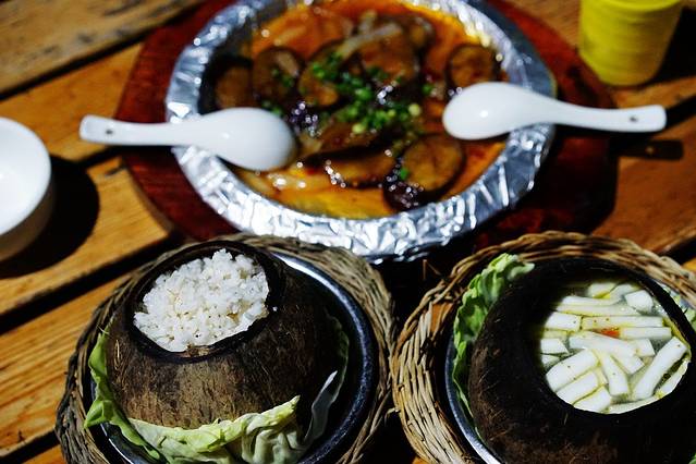 岛上晚上还营业的餐厅倒是没有白天开得多,不过也不止一家,包括山顶上那个餐厅也是可以去用餐的。我们当然就不想再爬一次山了,就在海边这家解决吧。一共点了三个菜而已,一个椰子饭、椰子鸡和茄子,这三个就要了100来块钱,不便宜呀,而且份量也稍小一些,没办法,基本也是独门生意了