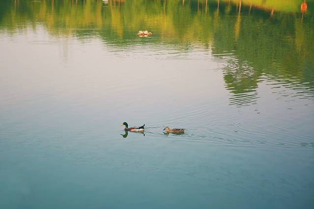 水中的野鸭和鲤鱼都欢快的享受着温暖的冬天