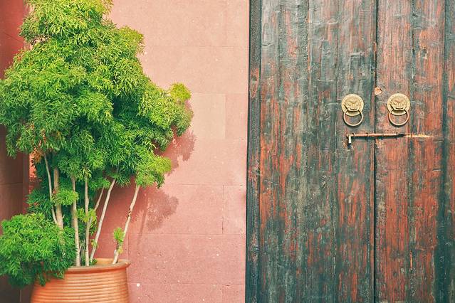 木制的门和传统的扣锁,搭配上砖红色的墙,再用绿色植物进行装点,另一种调调。