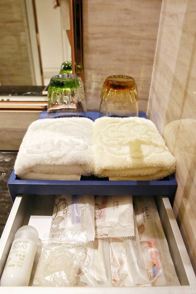 双色的毛巾和漱口杯,海盐还能放在浴缸里泡泡澡哦~还有润肤露~真的超贴心!