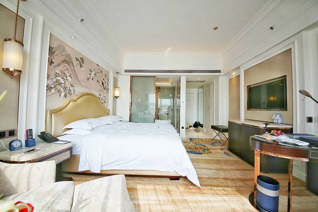 入住的豪华大床房装饰风格也是我很喜欢类型之一,欧式的富丽堂皇又加入了简约的特点,蓝色的窗帘搭配上房间的白色调,有一种清新海洋的感觉。
