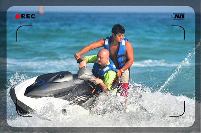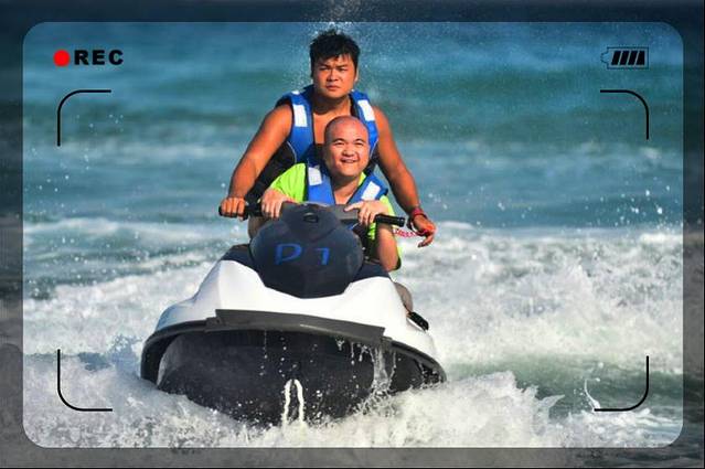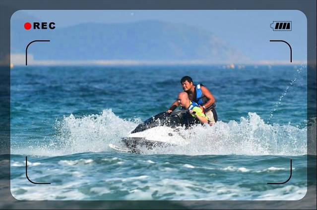 轻轻扭动钥匙,伴随着沉闷的轰鸣声,我穿上救生衣,跟着驾驶员骑着摩托艇,像一头马上就要扑杀奔跑的猛兽,冲向大海。
