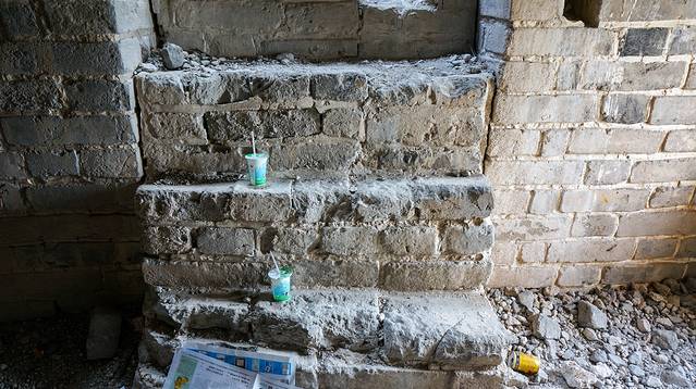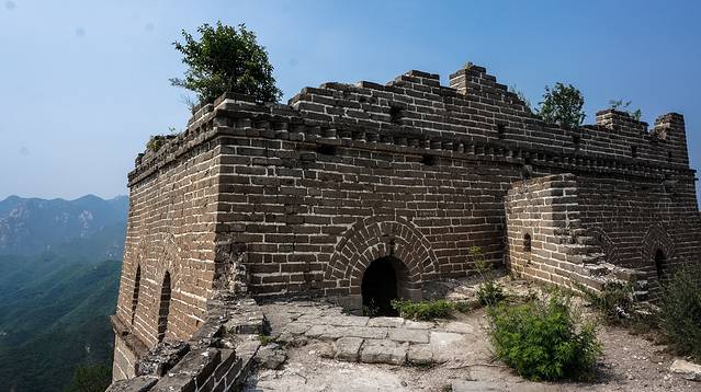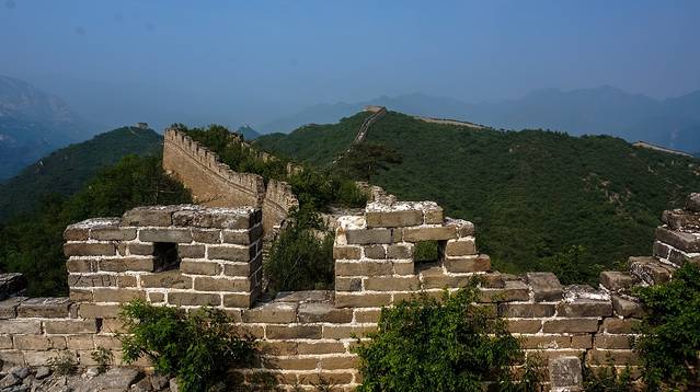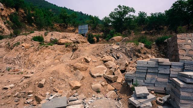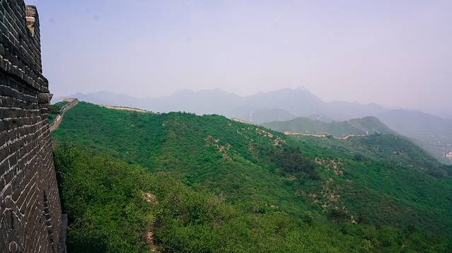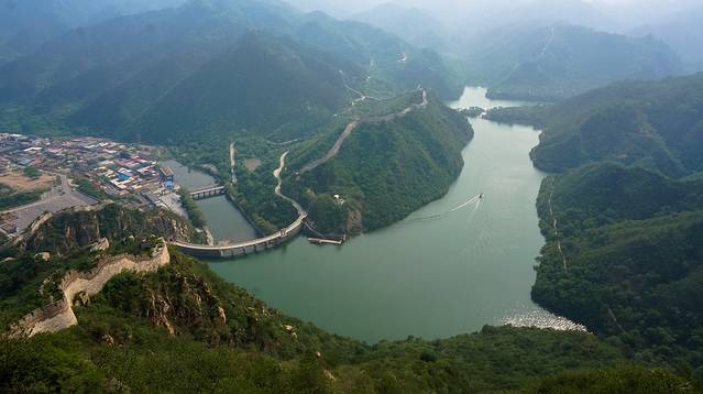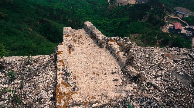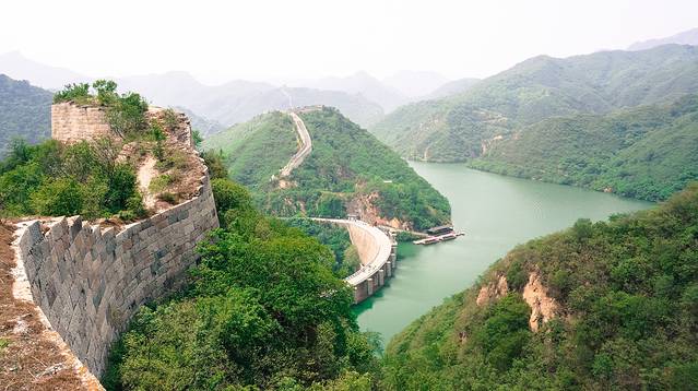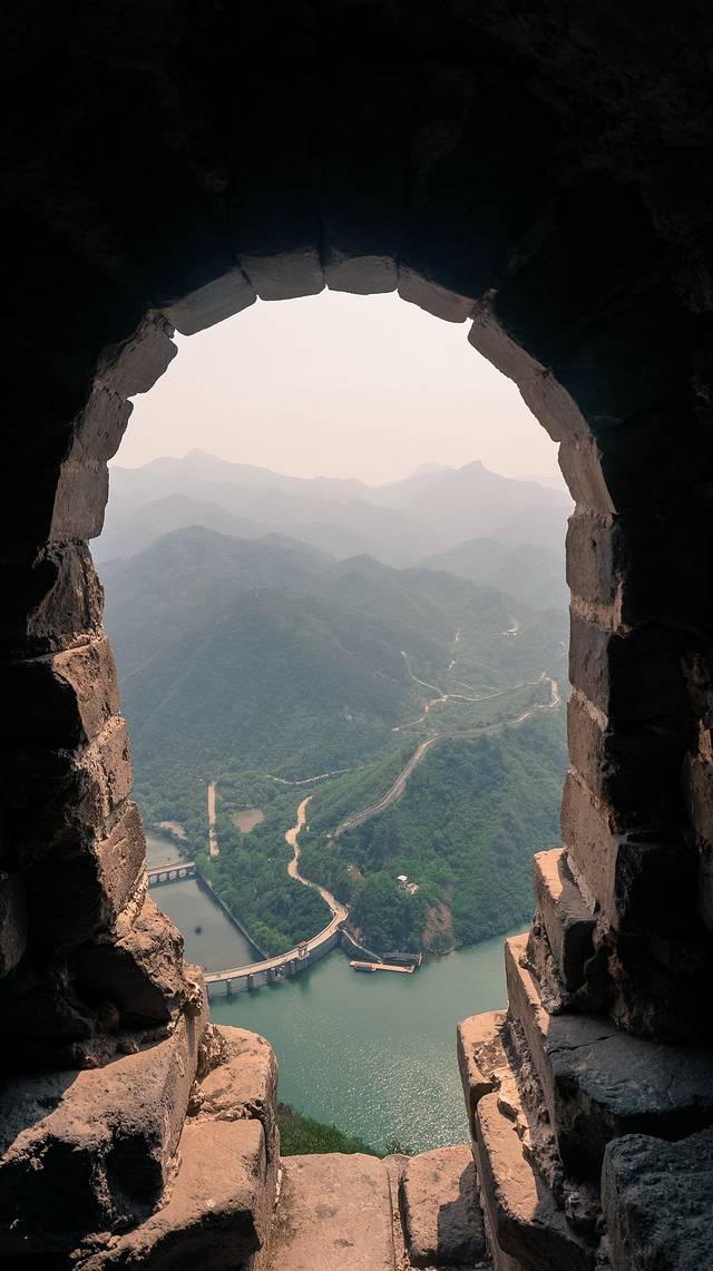 残破的墙体并不妨碍拍摄,反而由于位置较高,更适合拍水库的全貌