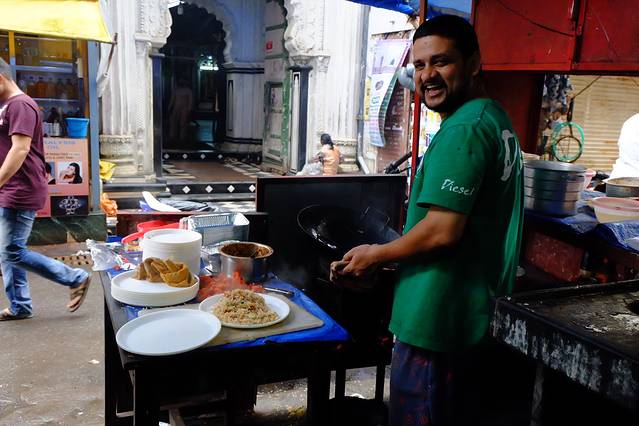 这家的鸡肉炒饭真的特别棒!!从集市穿过远远就能闻到香味,辣酱是香辣的那款,鸡肉嫩嫩的,连着三天吃了三次每次都想试试别的但一路过就忍不住,我们就是行走的活广告😂而且超便宜啊超便宜!后来在瓦拉纳西跟一个孟买医生聊天他也知道这家店,所以当地人应该也觉得很好吃吧