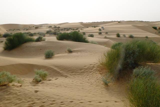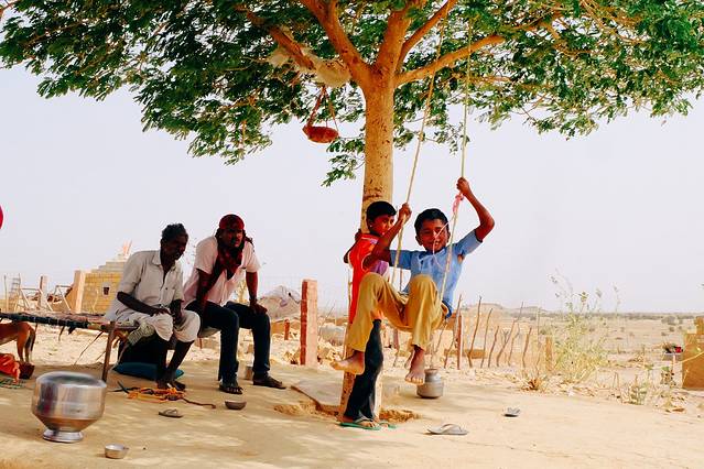 中午的时候坐在吉普车顶晃晃荡荡得穿过戈壁,路过一年一次降水形成的小湖,所有附近的生物都仰仗着这一汪水过活;路过几个规模很小的村落,吊在树秋千上会有老人倒来奶茶,妇女夸赞你的首饰,小孩在围成圈看着你,就像中东电影里那样在扬起的沙灰里追着你开远的吉普车跑