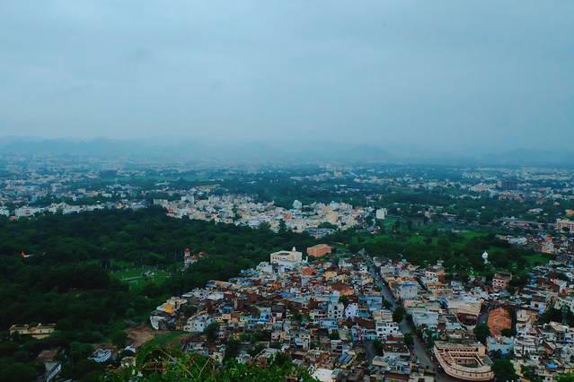 缆车在一个小山坡上,不记得名字也是跟出租司机比划着找的,90rs一个人,一共只有两个车厢,最惊喜的是还能看到孔雀站在林子里的枝桠上,山顶能看到一整片白城