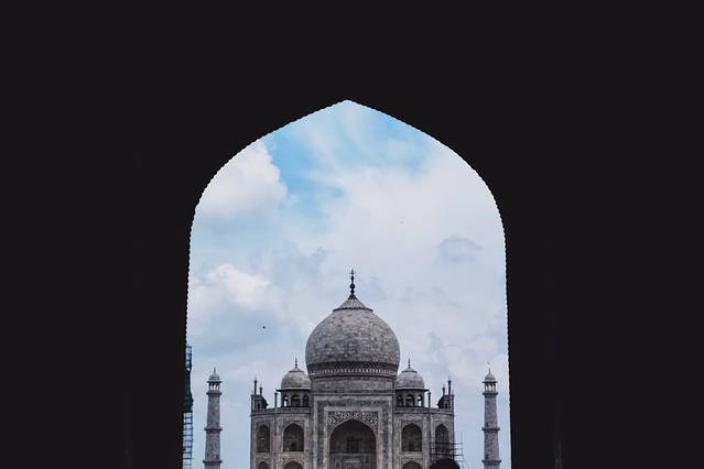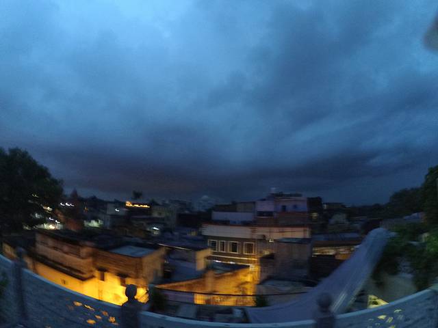 本想看泰姬陵的日出日落,恰逢的却是雨夜的傍晚清真寺传来深远的暄礼词,闪电在大片大片暗蓝色的天空里绽开,被雨打湿的屋顶能隐隐望到的泰姬陵