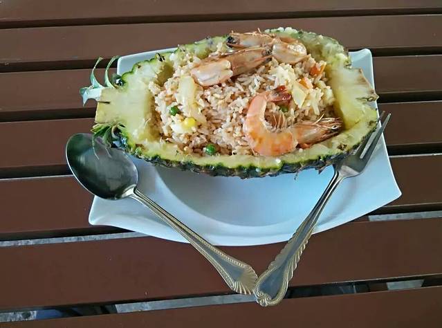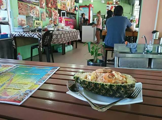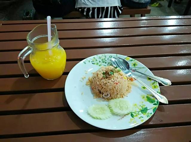 珍南海滩是兰卡威著名的海滩,因此也是最热闹的游览区,水上游乐项目也丰富,而且离机场也是最近的,汇聚了多家酒店与餐厅,消费很方便,就是偏贵啊!徒步路上没啥吃的地方,首顿午餐就在海滩附近,菠萝炒饭22元,上面放上几只并不美味的大虾作装饰,冰咖啡5元好大一杯,强烈怀疑菠萝船是反复用的,因为饭内只有少量菠萝丁,哪来那么多菠萝船呢?晚餐故地重临,因为货比多家,还是这家最实惠,可惜味道挺普通啊!海鲜炒饭18元+橙汁冰水4元,所谓海鲜就是虾和鱿鱼而已。幸亏马来西亚的调制饮料还挺对俺胃口,特爱喝。次日早餐还是这家,为了实惠徒步几百米也要去,可气为了赚钱,不提供特价9元的汤粉面,只能按餐牌点了这碗13元的番茄酱酸辣鸡肉汤面,马来面条又粗又没筋道,幸亏汤的味道还行。