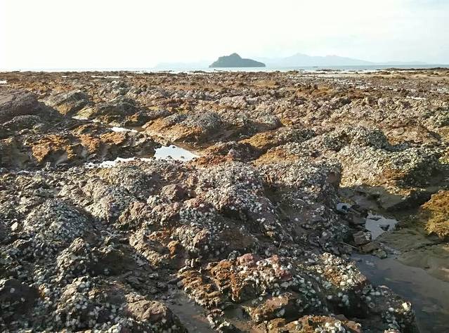 小休1小时后又继续徒步3公里去附近的黑沙滩。黑沙滩位于兰岛北部,沙子的确是黑色的,而且有不少垃圾,感觉有点脏!难怪不见游人,但有一大片的“外星球地貌”——奇特的礁石滩,当地人还在挖牡蛎呢。远处还相连着漂亮的丹绒海滩,可惜俺没毅力与时间走过去了。为了等待沙滩日落,直至19:00才离开,回程途中天已全黑,想不到老天爷再次化身本地黑人摩托大哥,主动邀俺搭车,但俺当时已经快走到酒店了,只能深表谢意了。