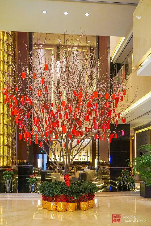 步入酒店大堂,感觉非常宽敞,挑高的大厅面积巨大,新春的装饰非常喜气,让人心情大好。