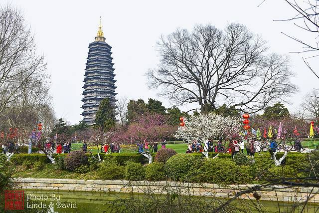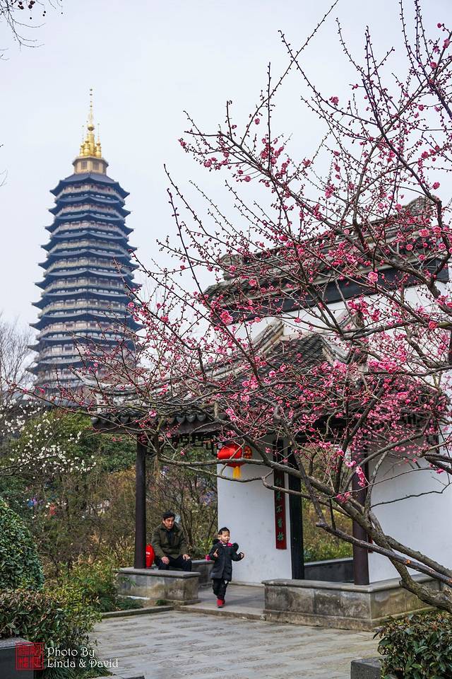 粉白嫣红的梅花盛开,簇拥着端庄的天宁宝塔,春日风景这边独好。