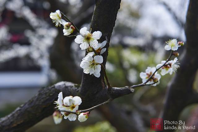 红梅阁原先是道教的圣地,因此墙面是黄色的呢,梅花以黄色为背景会显得特别漂亮!