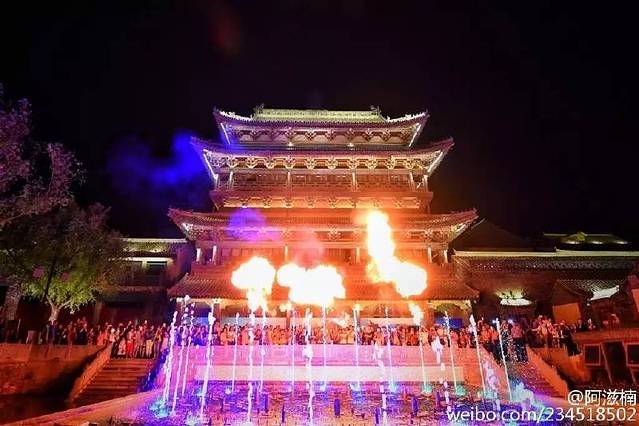 从长城下来正赶上望京楼前的水舞喷泉,大约20:15分开始的,首创水火交融的大气磅礴,一定要看一看。这是一场声、光、水的盛宴,视听效果远远高于一般的音乐喷泉。