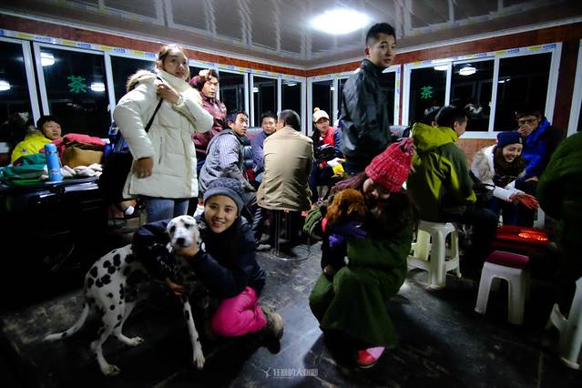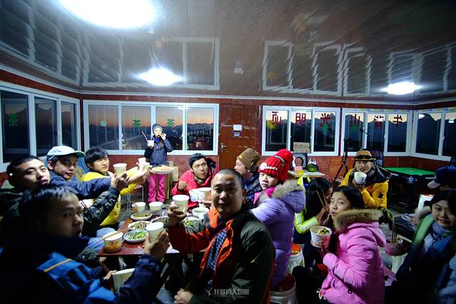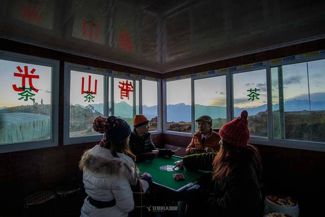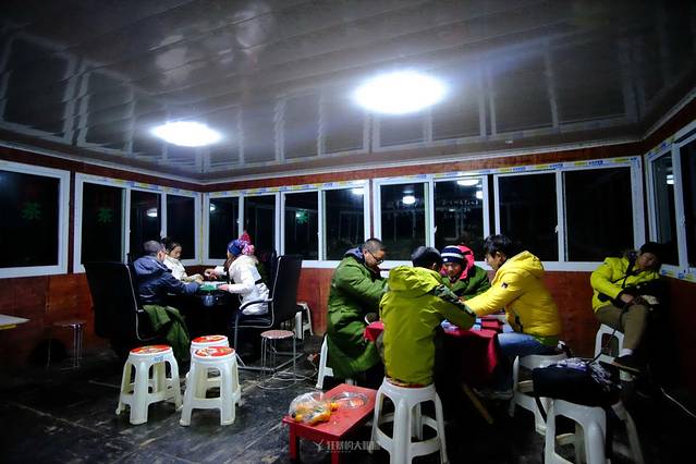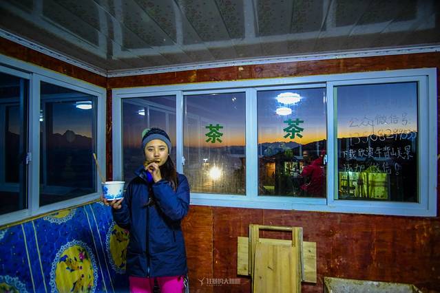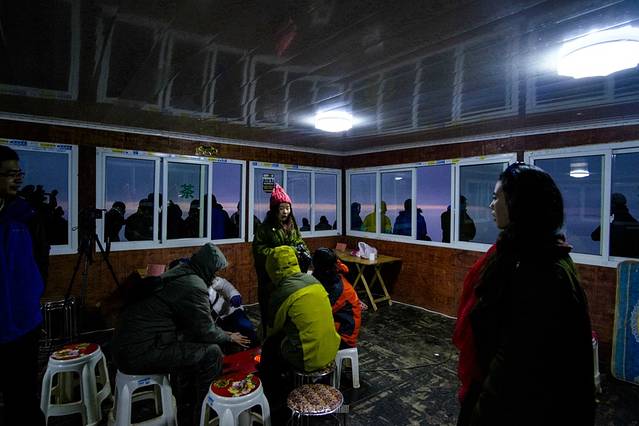 夜间的星空就出现了一个多小时,然后就开始弥漫着大雾,一直弥漫一直弥漫一直弥漫,狂风吹了整夜,我半夜起来了3次都无功而返,清晨7点,我打开窗户发现外面等待日出的人已经占满了山头,我坐在床上观察着外面的情况,头顶上的乌云很厚,今天的日出希望不是太大了,慢慢悠悠的起来走到茶坊里烤火等日出,回想起以前来的时候站在山顶等日出冻的跟狗意思,这次简直是太舒服了。