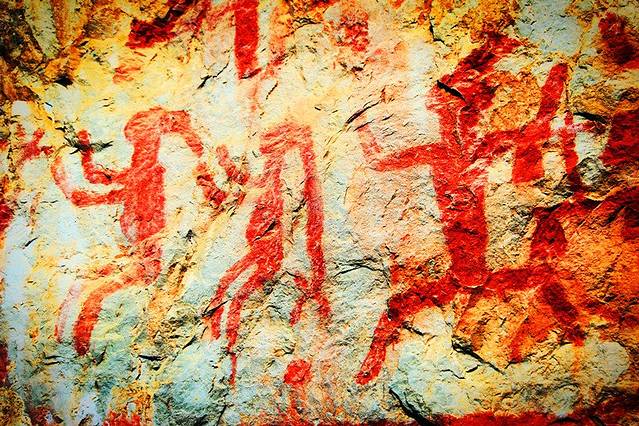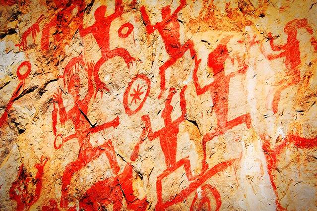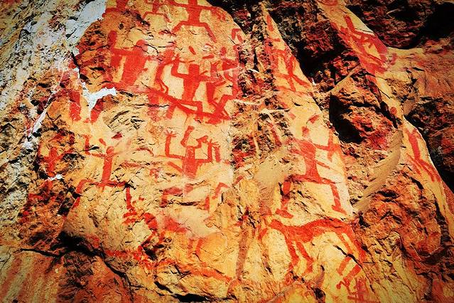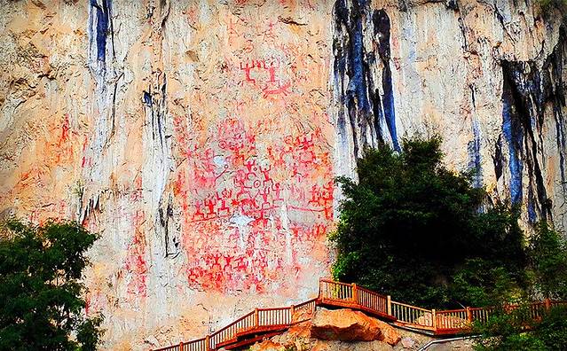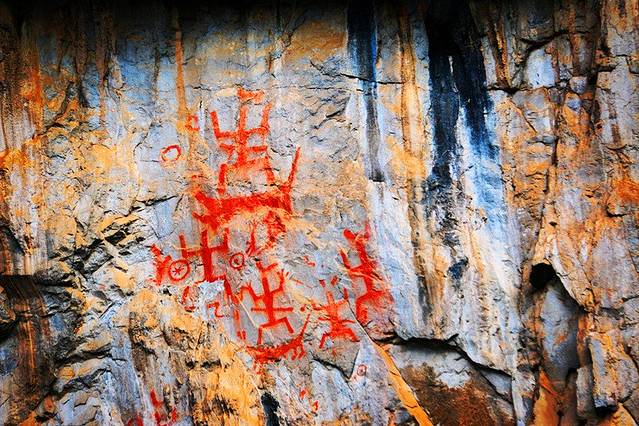 垂直的峭崖上画满了各种红色的形象:或两手高举、两脚叉开成立马式,或两手平伸、两腿微蹲成跳跃式;还有铜鼓兵器牲畜车马,既如练兵习武,又如狂舞欢歌。一组组的图画,似乎在向我们叙述着一个个古老的故事。