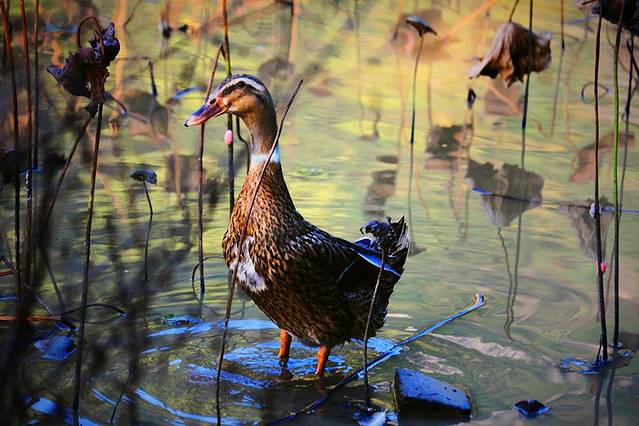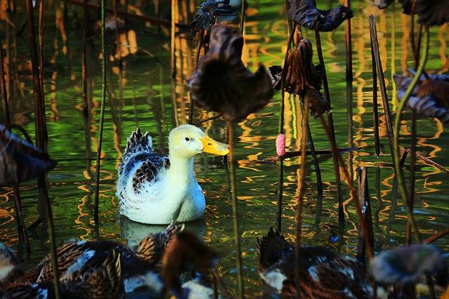 几只塘鸭欢快地在残荷间嬉戏,全然不觉冬日已经来临……