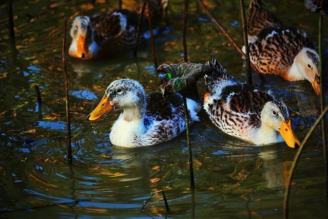 鸭嬉残荷小塘浅,枯荣淡去冬意浓。花开过了、莲蓬也采过了,夏日里那些遮天蔽日的青荷大都已折戟沉沙。村中的小塘里却仍有几茎残荷在夕阳下中坚守,像是一面旗帜,顽强地展示生存与睿智。