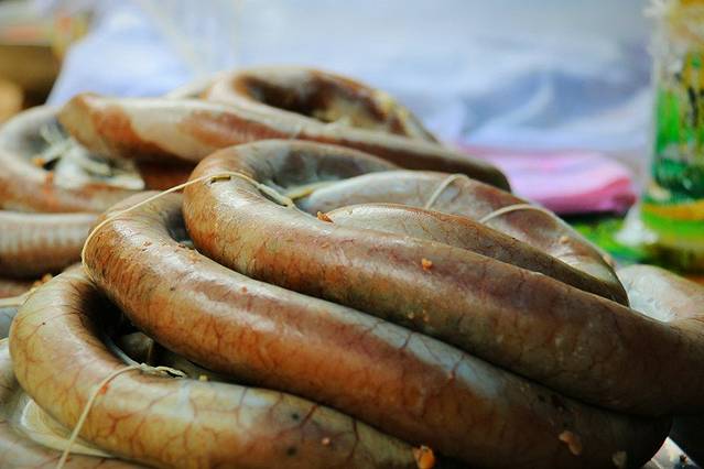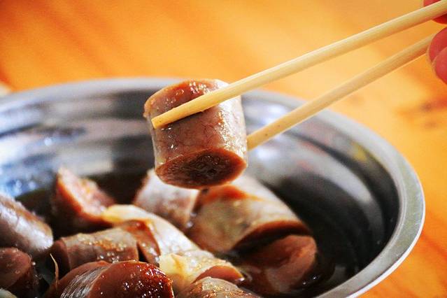 灌肠是地道的宁明美食,选用猪大肠或猪粉肠,灌进猪血、米粉、葱花、香菜、花生、芝麻等蒸制而成。