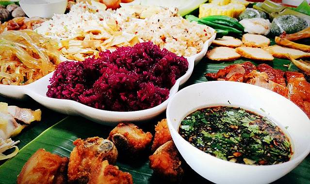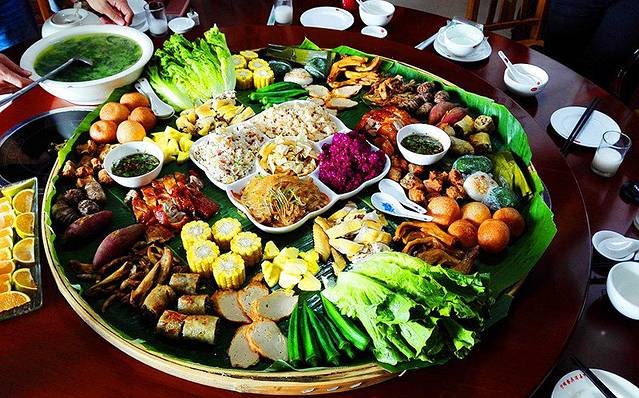 当一盘摆得满满的“簸箕宴”端上桌的时候,房间里顿时充满了食客们的赞叹声。竹簸箕做盘,新鲜的芭蕉叶铺底,上面是诱人的各种美食——白斩鸡、烧鸭、炸河鱼、鸭掌、春卷……配上紫色糯米饭,还有当地的芋头红薯玉米,彩色丰富,营养搭配齐全,让人垂涎欲滴。