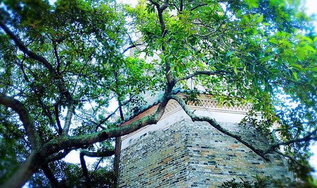 塔侧有一古榕,绿色枝叶拦腰拥抱古塔,不远处还有一座荷塘,荷叶层层叠叠,夏天时盛放一定也是绝美的风景。