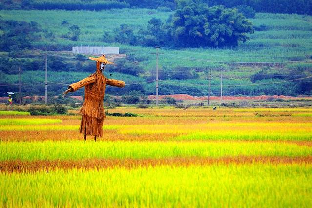 风儿吹过,泛起阵阵稻浪,还有若干趣怪的“稻草人”跳舞游戏其间,一切都美妙得令人心醉,仿佛听见一群精灵在快乐地呻吟。