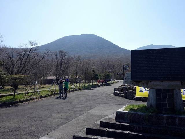很多人在自然史博物馆的院子里拍照,后面就是汉拿山主峰,从这里看上去并不太高。