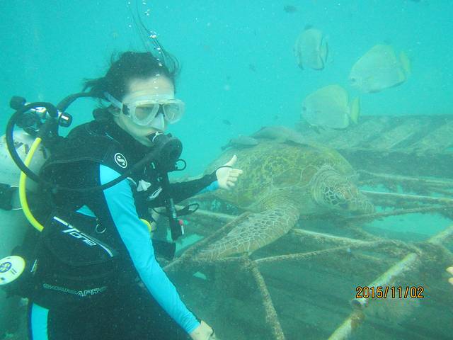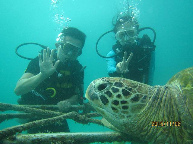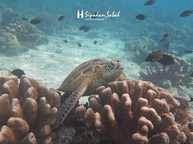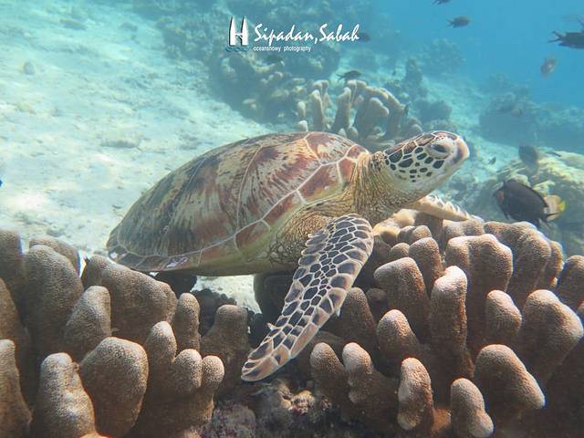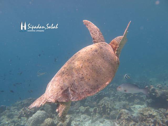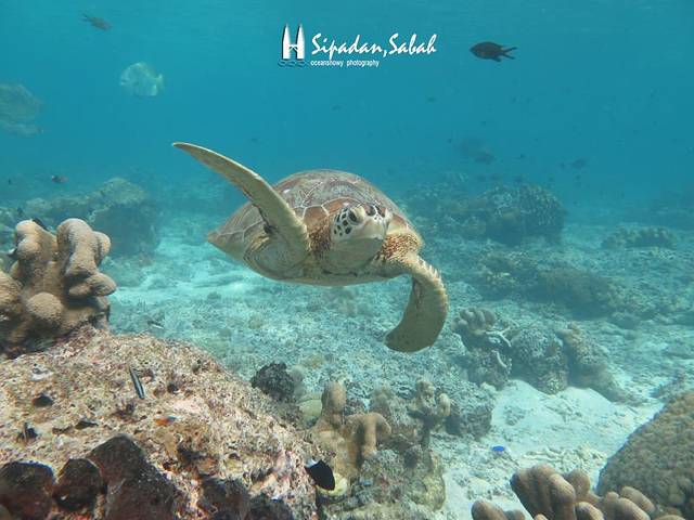这天的诗巴丹深潜有些令人失望了。主要原因一是天气不给力;二是教练不给力。天气方面,这天早晨马布岛一直是阴天,我在仙本那倒是大晴天,而她们在诗巴丹确实下雨,真是海上气候变化快啊。下雨后海龟数量骤减,能见度也不如晴天了。虽然深潜影响没有浮潜大,但是频繁的海浪和洋流还是影响了游玩时间的。教练方面,由于Alan要去仙本那,只能换了一个教练带,这个教练不能说不专业,只能说是比较谨慎,始终抓着我们不放开,也就没有照什么相啦,更悲剧的是还租了150令吉一天的相机,早知如此还不如用自己的相机了。不过后来想想,诗巴丹的洋流复杂,谨慎点总是好的,出来玩安全始终是第一位的嘛。