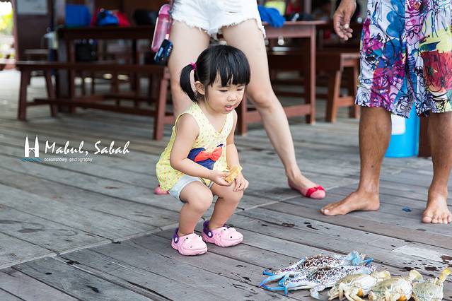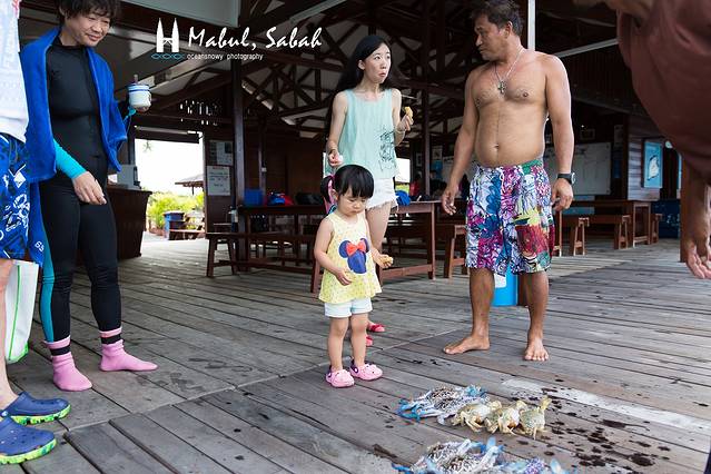 第一个潜点持续了约40分钟,船停靠岸边,进入吃吃喝喝踩沙滩模式。这是小家伙喜欢的,我们决定让小家伙下海和鱼共泳,可可刚开始还很愿意,套着救生衣游得很高兴,我们平时经常带她去游泳池,她基本能自己保持平衡向前游。但是怎知海的浮力太大,还有小小的风浪,一个不小心,小家伙就来了个狗吃屎,喝了一大口海水,这下好了,海水的滋味可不好喝,诗巴丹的海水更咸。