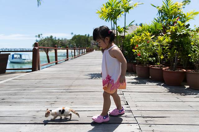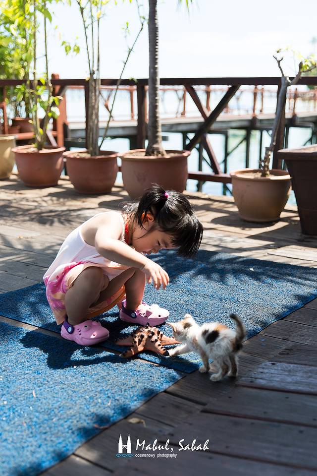 小家伙就静静的蹲着看,看了好久。后来问了当地人,说没毒。可可便高兴的带着她的小海星和餐厅门口的小猫玩去了。小猫对海星也比较感兴趣,用爪子挠一下,发现海星不动,于是大胆了起来,玩的不亦乐乎。