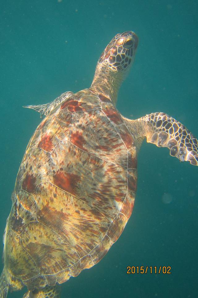 第一个潜点,我们看到很多欧美人在船潜,想到这里应该不错,果然,我刚跳下水,映入眼帘的就是连绵不断的各色珊瑚和鱼。这些鱼大部分是燕鱼和蝴蝶鱼,还有一些白关刀,另外的一些小鱼我也叫不上名字。我们的入水点比较浅,大约有3米深左右。往前游动一点,就看到一只大海龟,好惊喜啊,没想到后来海龟多的都看腻了。