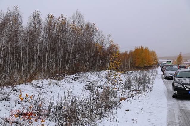 这一天,车里面的温度表从零上20度下降到零上5度,从秋天直接来到了冬天。路上已经开始飘雪花刮风了