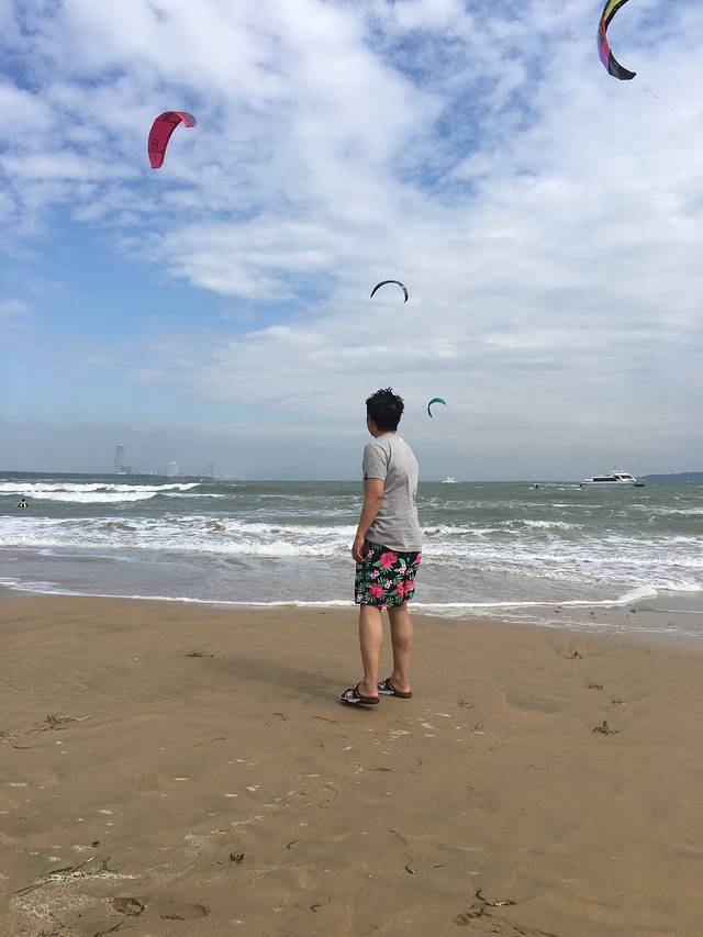 码头旁有很多风筝冲浪,X先生很感兴趣。