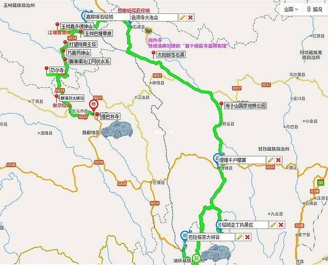 2 自驾路线:巴拉格宗(100公里)——得荣(100公里)——乡城(156公里)——亚丁(124公里)。