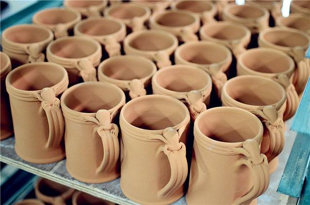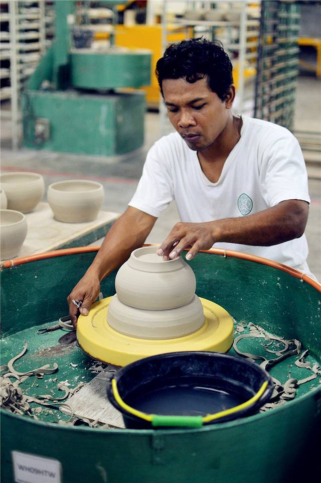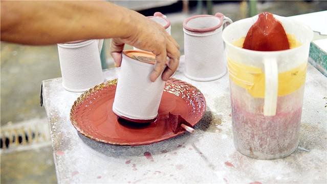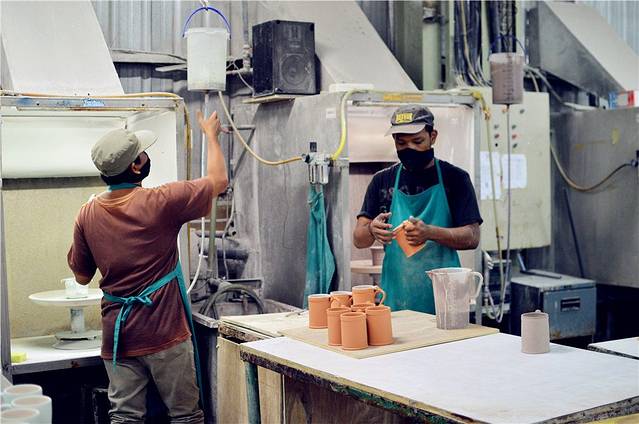 工人正在喷漆间为杯子整体上色,这个颜色是砖色。
