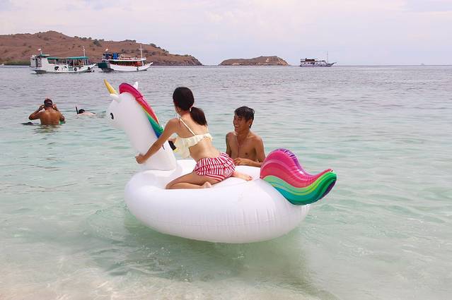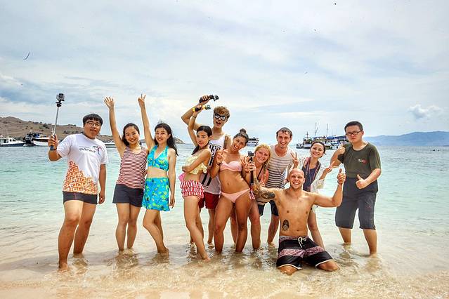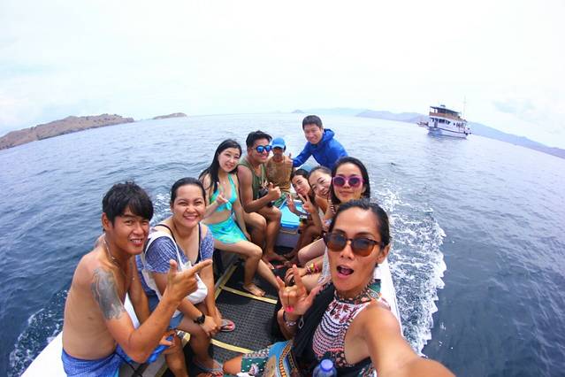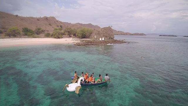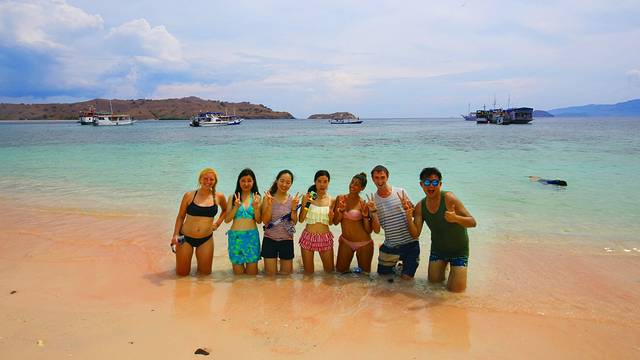 我们从我们的船上乘坐一个小艇,分批前往粉红沙滩,Griska用鱼眼镜头我们来个自拍,单手持又重又大单反来自拍,太厉害了word姐,苗条的身体,大大的力量,看我们笑得多灿烂。
